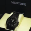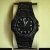The watch features a stainless steel strap chain, built for durability and long-lasting shine, while the Arabic numeral dial adds a touch of cultural elegance and exclusivity. Its deep black finish, paired with the full crystal-set body, delivers a look that is both modern and timeless.